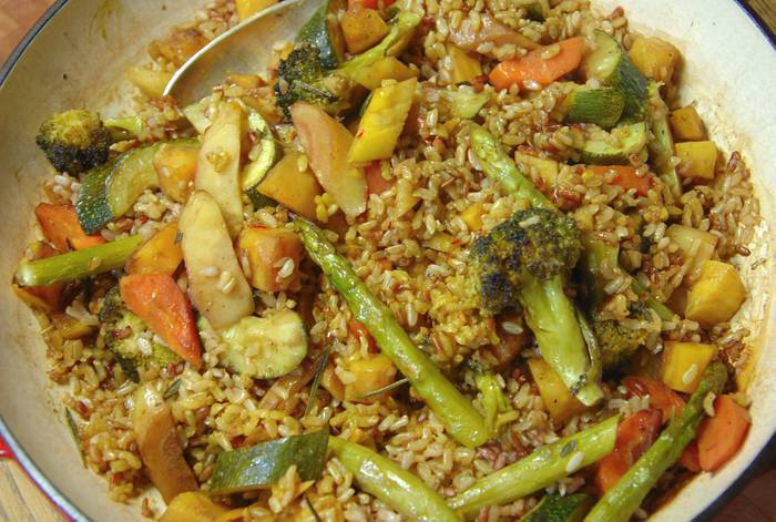Обычно в паэлье гораздо больше деликатесных ингредиентов и много морепродуктов, а это такая вариация на тему паэльи. Неплохо добавить еще и корень сельдерея или петрушки. Овощи можно приготовить на пару, но при запекании на гриле вкус получается ярче, хорошо также сбрызнуть овощи кленовым сиропом, жидким медом или соевым соусом. Сделать такое блюдо можно заранее, а затем разложить в порционные пакеты и заморозить — это очень удобно, особенно в середине недели, когда нет времени.