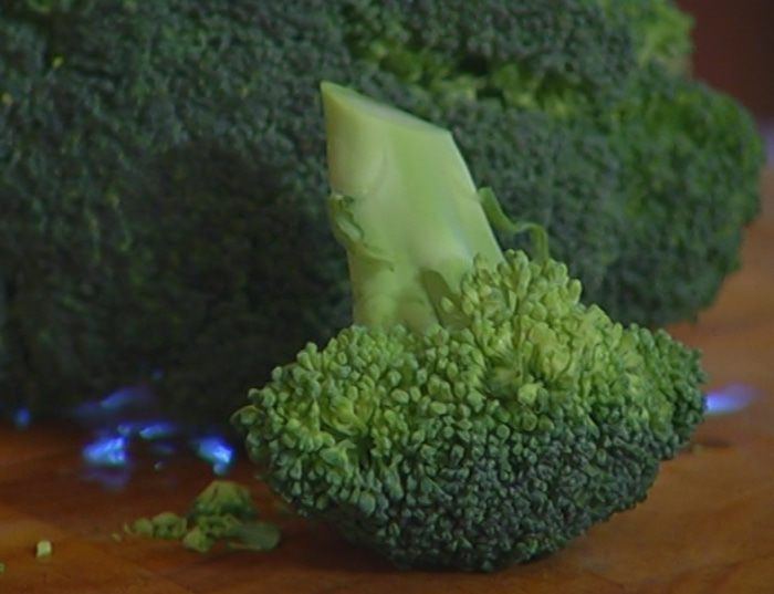 Спаржу, удалив грубые черенки, разрезать пополам.