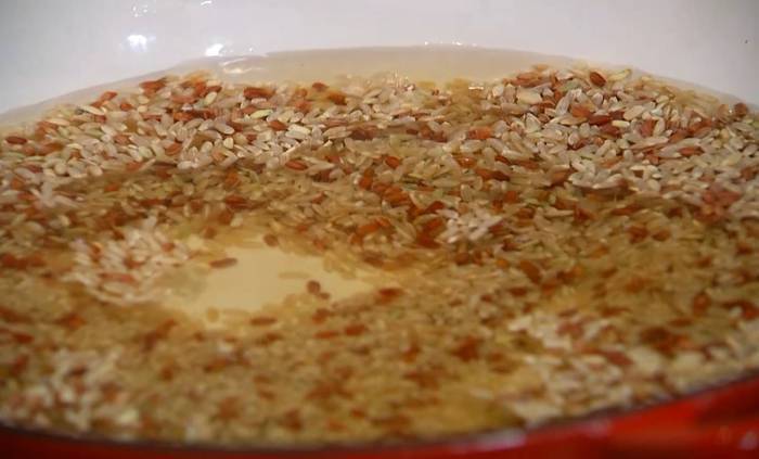 Рис всыпать в тяжелую сковороду или сотейник, влить 600 мл горячего бульона, накрыть крышкой и довести почти до готовности.