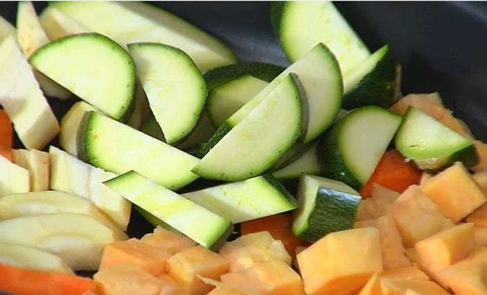 Цукини нарезать полукружьями толщиной около сантиметра.