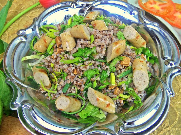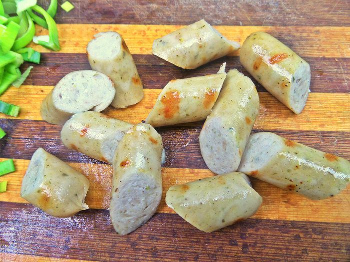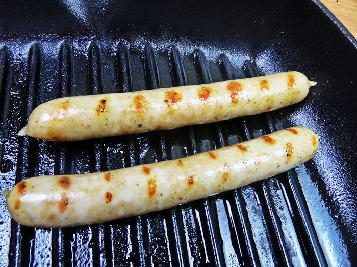 Колбаски (у меня куриные для гриля,без красителей, поэтому такие бледные) обжарить на гриль-сковороде.