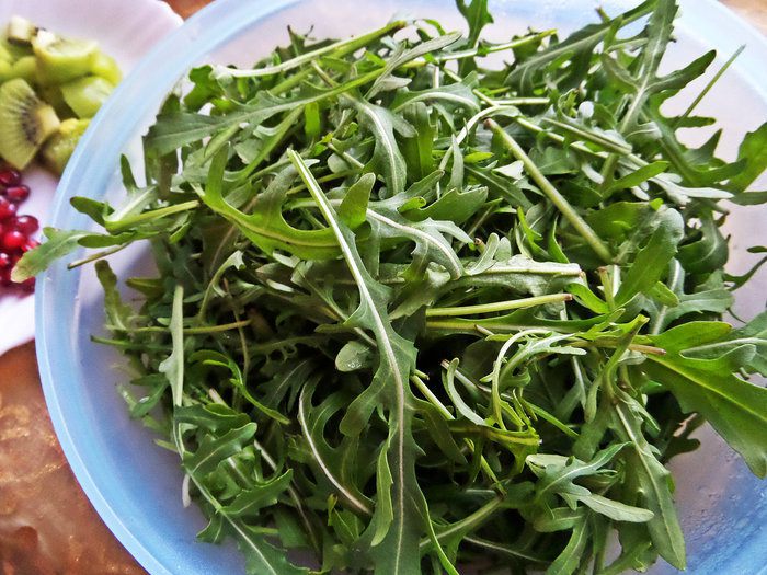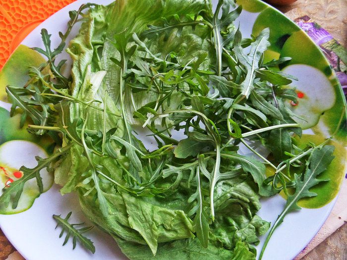 На большой тарелке нарвать салат айсберг и насыпать руколу.