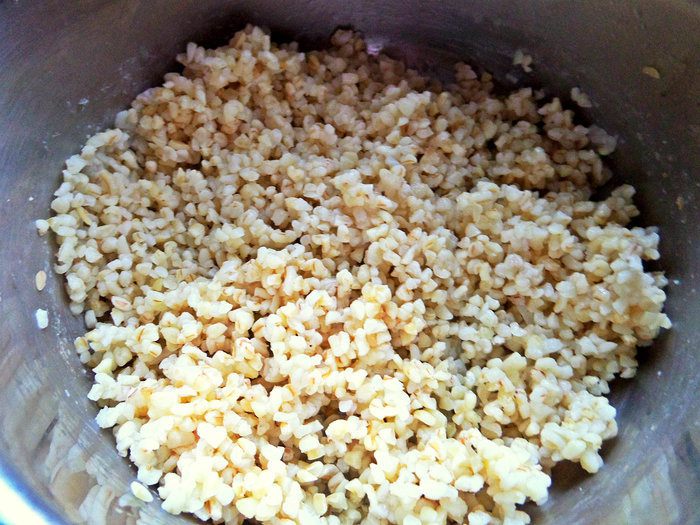 Булгур сварить согласно инструкции. Мой варился 15 минут вначале в стакане воды,но потом потребовалось еще долить воду. Весь в салат не использавала.