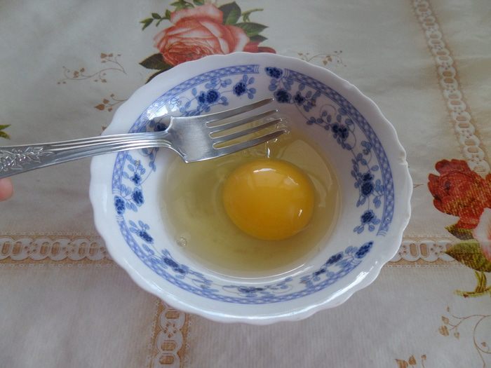 Яйцо разбиваем в чашку и слегка взбиваем, добавив щепотку соли.