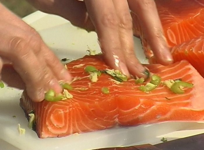 Перемешать цедру лайма, имбирь, чили, листья зеленого базилика и щепотку соли и натереть получившейся смесью семгу.