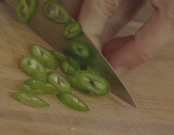 Перец чили освободить от семян и нарезать небольшими кубиками.