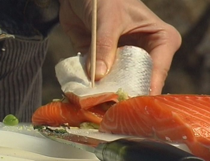 Сложить каждый кусок рыбы пополам, скрепить зубочистками и жарить на гриле 5–8 минут.