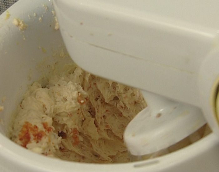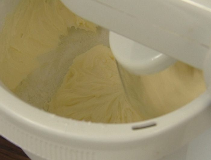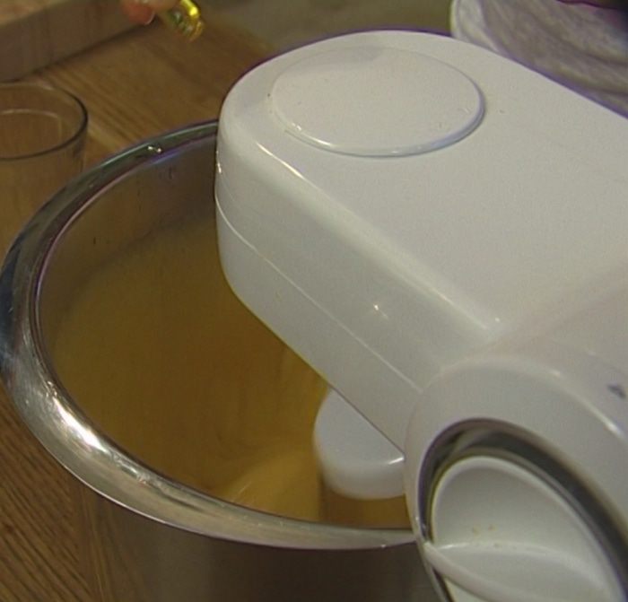 Взбить 250 г предварительно размягченного сливочного масла со 180 г сахарной пудры.