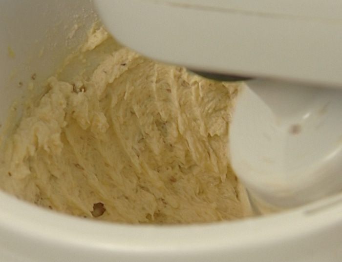 Частями ввести муку с миндалем, затем добавить курагу и все тщательно перемешать.