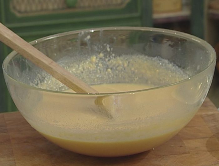 Желтки взбить с оставшейся сахарной пудрой, добавить молоко.