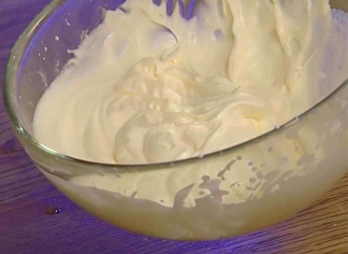 Предварительно охлажденные сливки взбить.