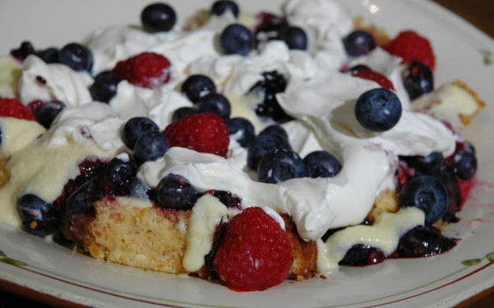 Сбрызнуть вином, сверху выложить крем, мятые ягоды, взбитые сливки, украсть целыми ягодами.