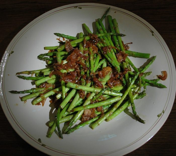В этом салате лучше использовать тайскую мини-спаржу, вместо устричного соуса можно добавить рыбный соус Nam Pla, хотя устричный предпочтительней.
