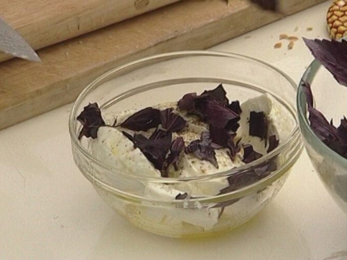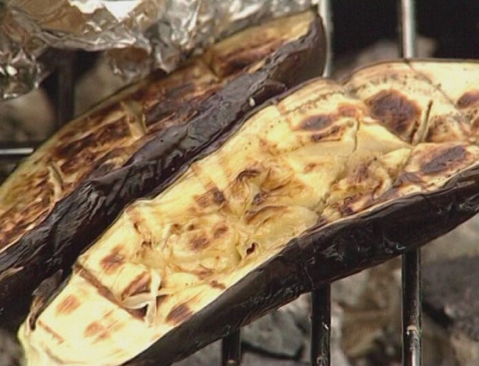 Баклажаны разрезать вдоль пополам, в мякоти сделать надрезы, присыпать солью и оставить на 10 минут, затем сбрызнуть оливковым маслом и обжарить на гриле.
