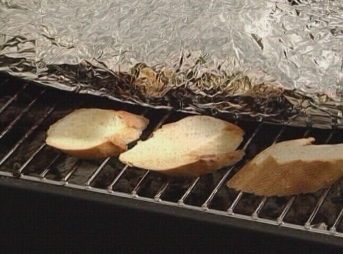 Хлеб нарезать, обжарить с обеих сторон на гриле, натереть чесноком.