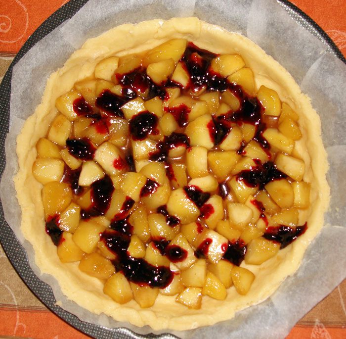 Нагреть духовку на 180-190 градусов, форму застелить пергаментом и смазать маслом. Тесто раскатать в пласт толщиной около 1 см, наколоть по всей поверхности вилкой, выложить в форму и сформировать бортики. На корж выложить яблочную начинку, добавить немного варенья или вишни.