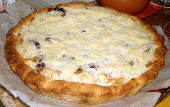 для посыпки: 50 г охлажденного сливочного масла, 1 ч. ложка ванильного сахара, 2 ст. ложки сахара, 3 ст. ложки муки