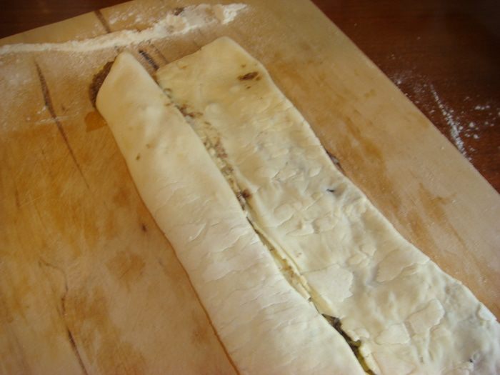 Разложить пласт теста на столе. Выложить на тесто ровным слоем половину получившейся смеси. Завернуть тесто с двух сторон, конец к концу. Еще раз завернуть тесто, потом сложить пополам так, чтобы получилось 8 слоев.