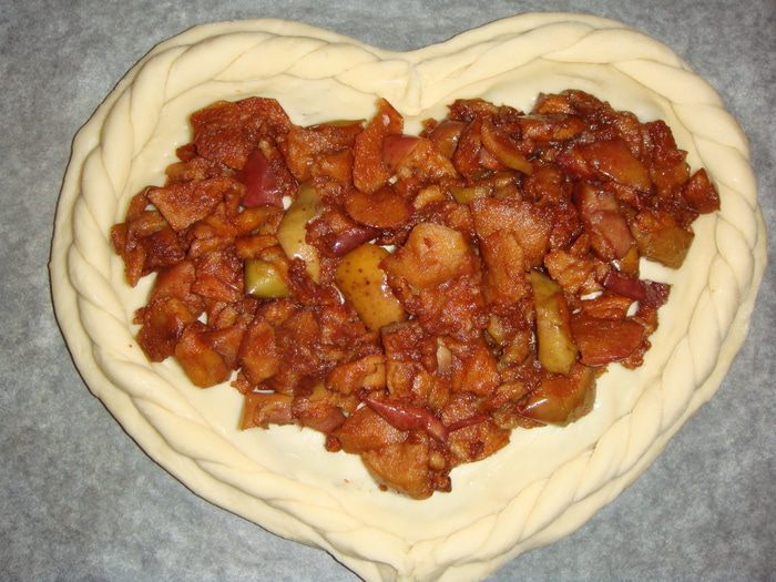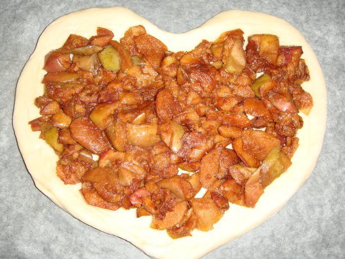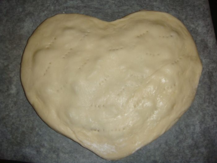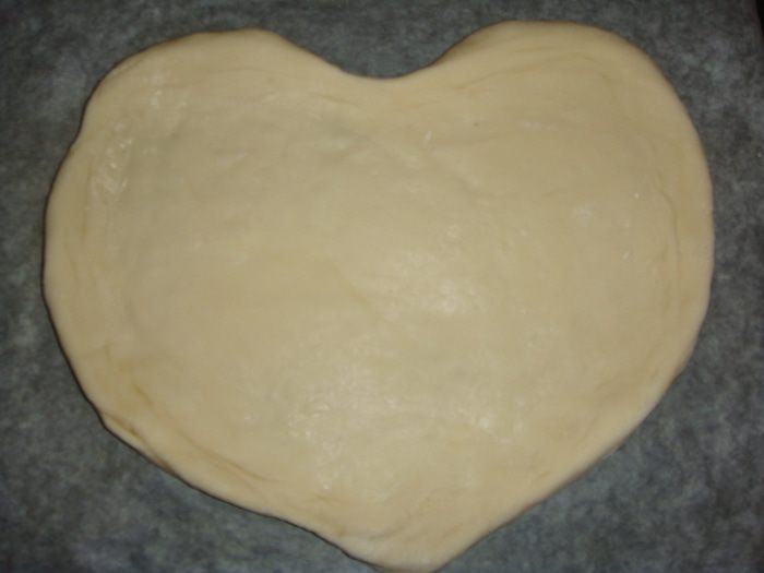 Противень застелить пергаментом. Большую часть теста раскатать и переложить на противень. Придать тесту форму сердца, сделав небольшие бортики.