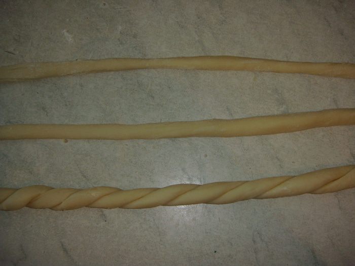 От третьей части теста отрезать 4 кусочка. Скатать из них жгутики. Переплести между собой по два жгутика.