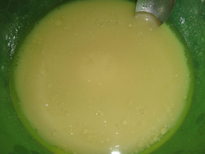 Перелить сыворотку в миску, добавить подсолнечное масло, желток (белок оставим для смазывания), все перемешать.