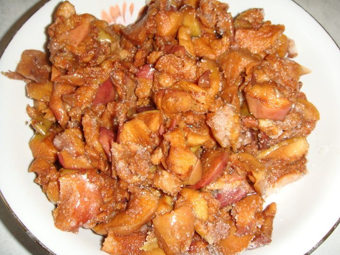Я использую замороженные яблоки. Предварительно их разморозить и слить лишнюю жидкость. Свежие яблоки почистить, удалить сердцевину и нарезать небольшими ломтиками. Смешать яблоки с сахаром.