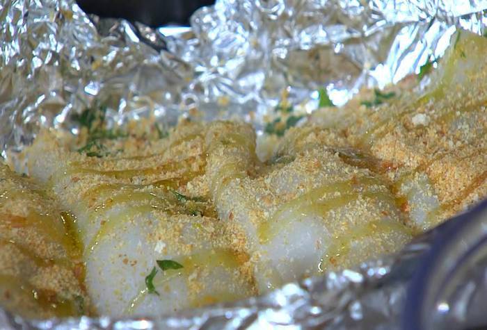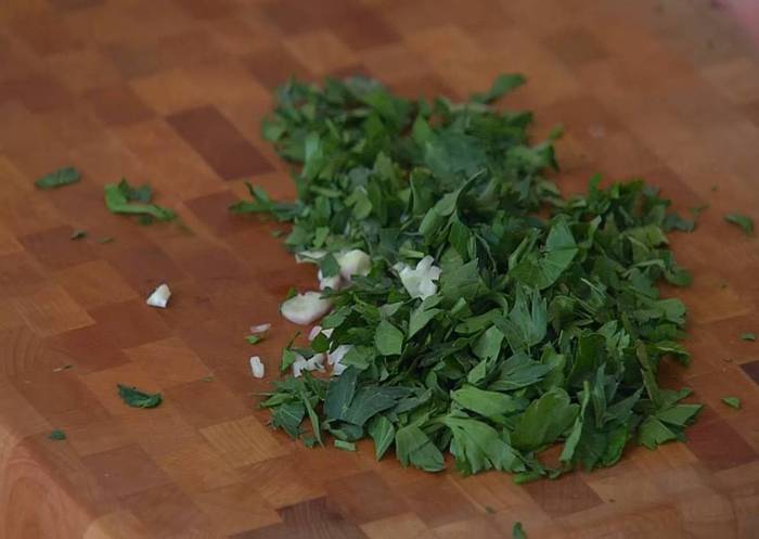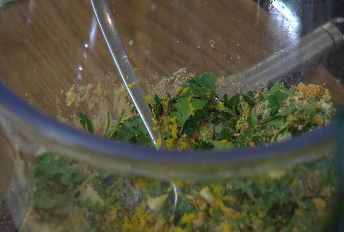 Нарезанную петрушку и анчоусы соединить с апельсиновой цедрой, домашними сухарями (немного сухарей оставить), чесноком и каперсами, добавить пеперончино, влить 1 ст. ложку оливкового масла и все перемешать.