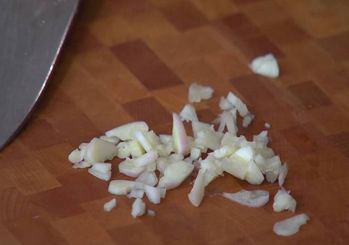 Чеснок почистить, раздавить плоской стороной ножа и мелко порезать.