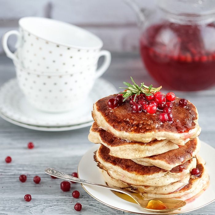 Белок взбить до крепкой пены, добавить в тесто и аккуратно спатулой перемешать до объединения, опять же долго не мешать. Выпекать на сухой сковороде без масла. Как только на поверхности появились первые пузыри, переворачивать. Подавать с медом, сиропами или чем душе угодно.