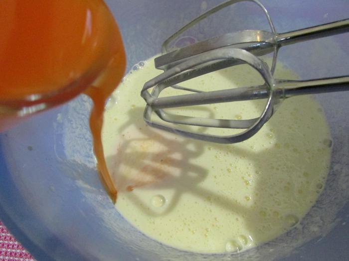 Приготовить сок из моркови, примерно 130 мл (я взяла готовый морковный сок). Влить сок в сметанно-яичную смесь и хорошо размешать.