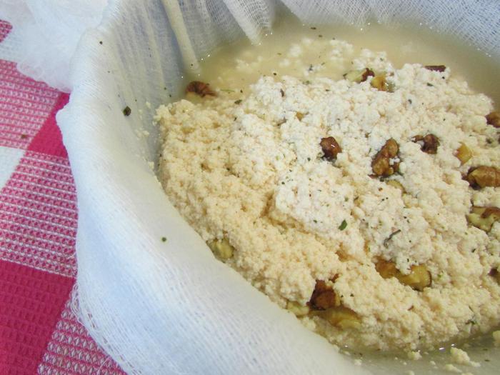 Затем сыр откинуть на дуршлаг, простеленный марлей в 4 слоя. Сыр хорошо отжать.