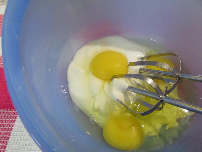Этим временем слега взбить сметану и яйца до однородной массы.