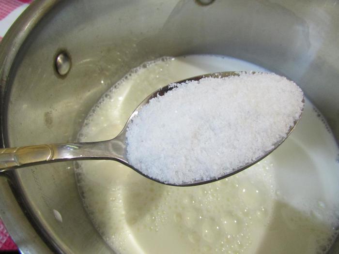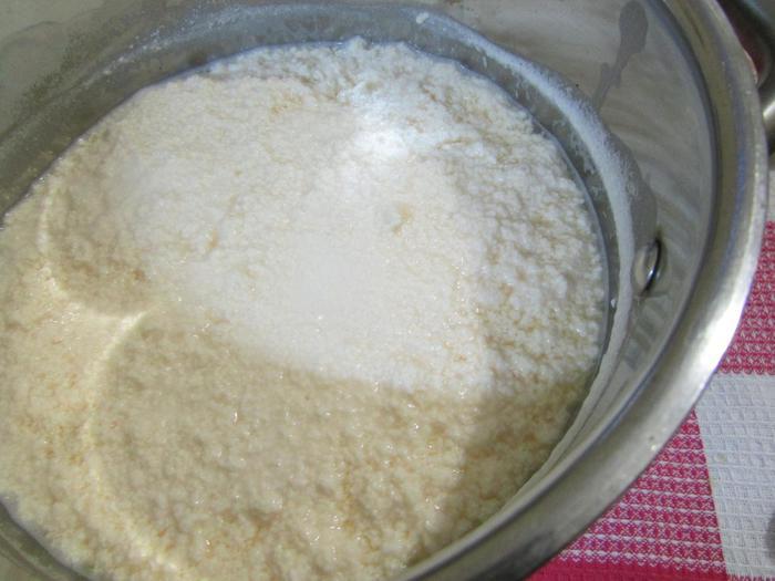Затем тонкой струйкой влить массу в кипящее молоко. Варить, помешивая 5 — 6 минут. Массу снять с огня и дать остыть.