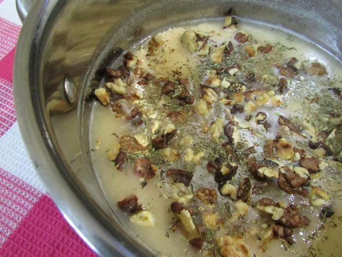 Когда творожная масса остынет, добавить орехи и щепотку прованских трав. Хорошо перемешать.
