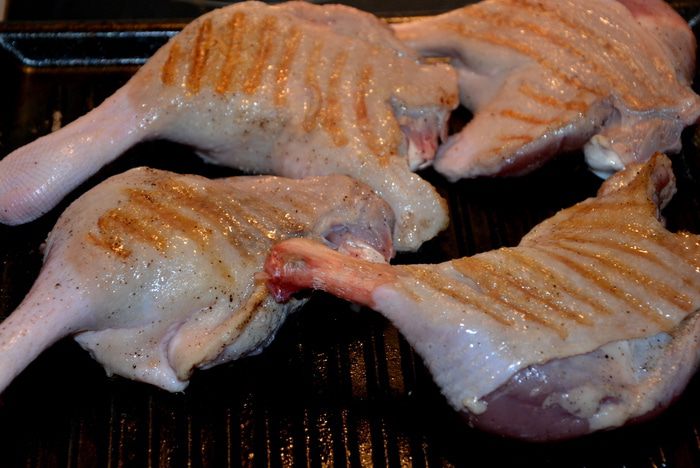 Обжарить на сухой холодной сковороде с двух сторон. Это значит положили ножки на сковороду и только после этого включили плиту, так утиная кожа не свернется.