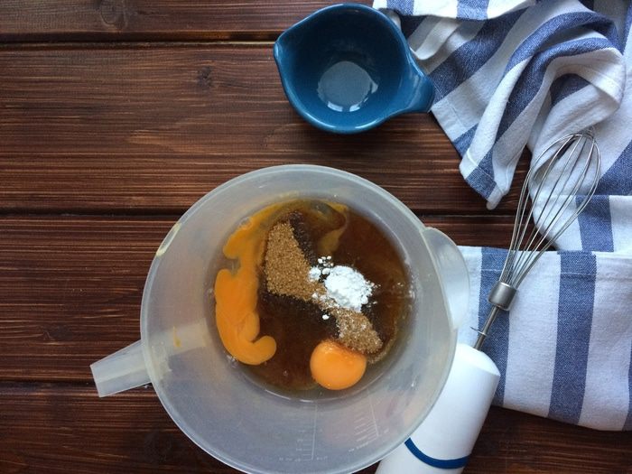 В другой миске взбейте яйца с сахаром и крахмалом.