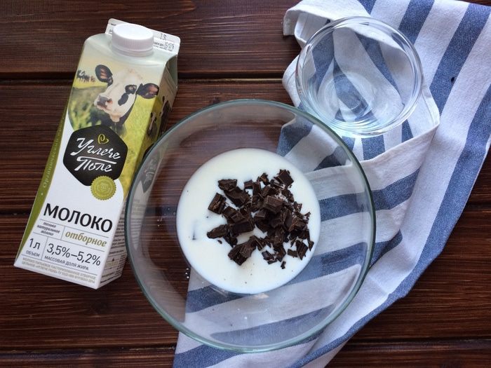 Приготовьте соус. Разломайте шоколад на кусочки, положите в жаропрочную миску, добавьте молоко.