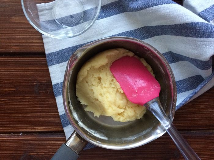Хорошенько перемешайте силиконовой лопаткой, чтобы получилось густое тесто, поставьте кастрюлю обратно на огонь и вымешивайте 30 секунд. Снимите с огня и дайте тесту немного остыть.