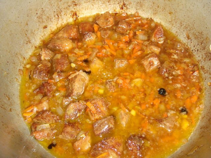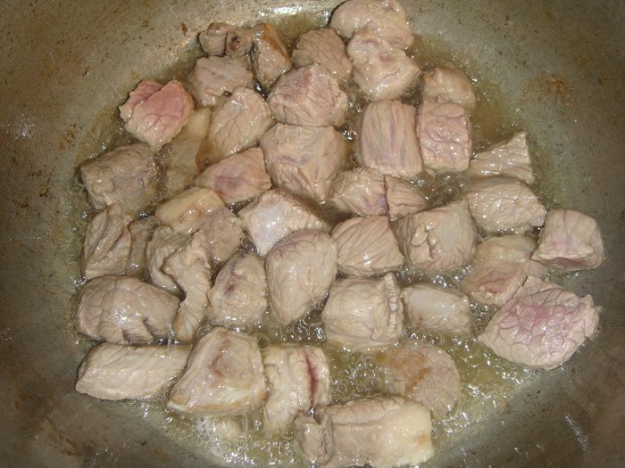 Казан поставить на огонь, налить масло и прогреть. Выложить и обжарить мясо.
