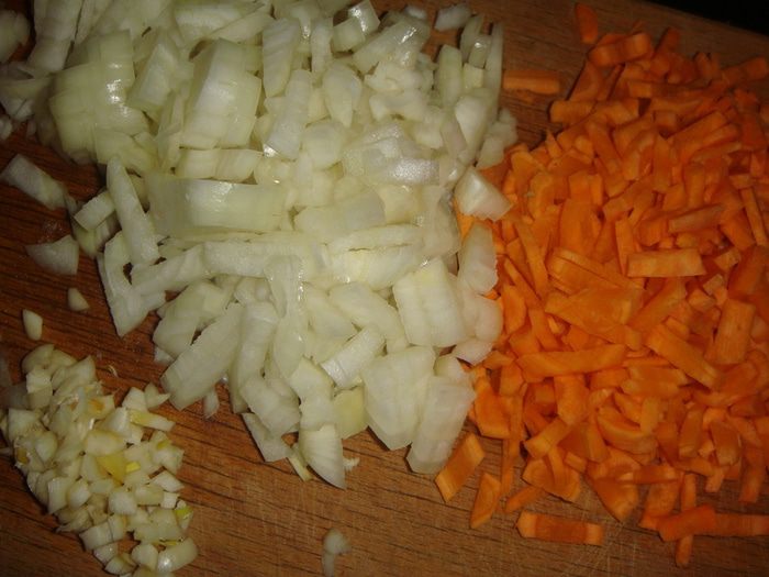 Лук нарезать кубиками, морковь — соломкой, чеснок мелко порубить ножом.
