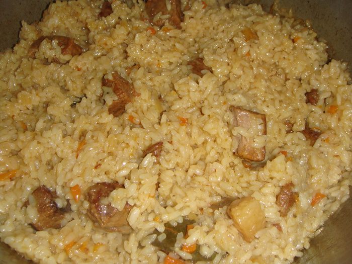 Через 30 минут выключить плиту, плов перемешать и закрыть крышкой. Дать настояться 20 минут и подавать к столу. Приятного аппетита!
