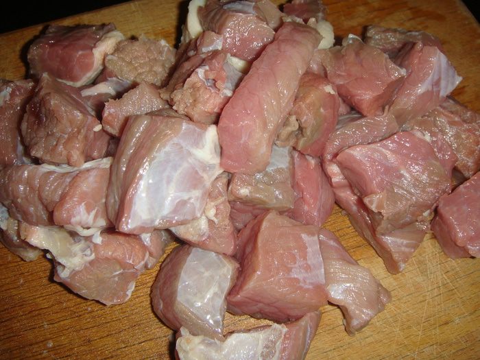 Говядину промыть и нарезать кусочками.