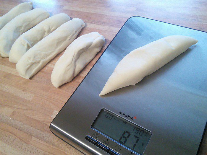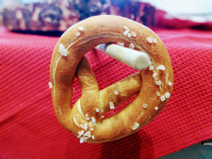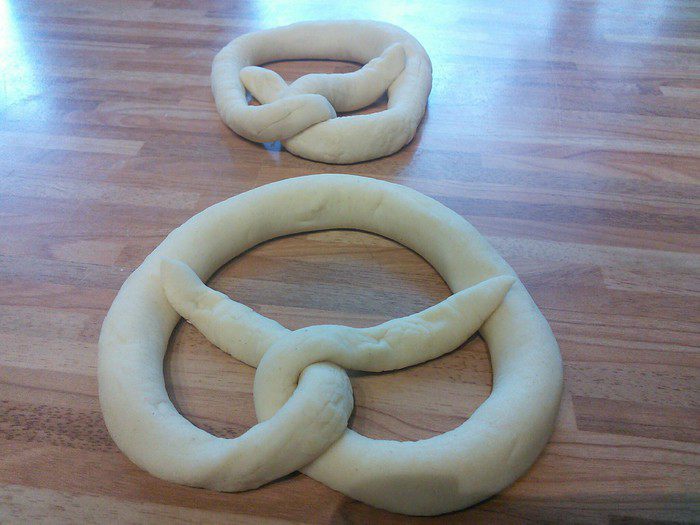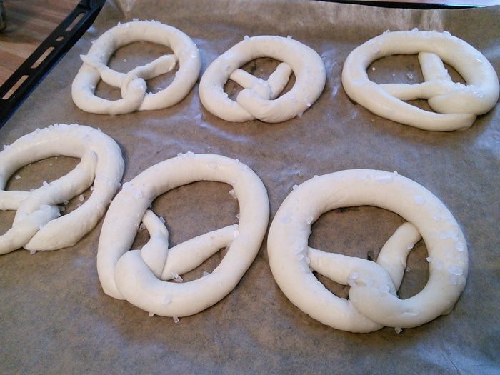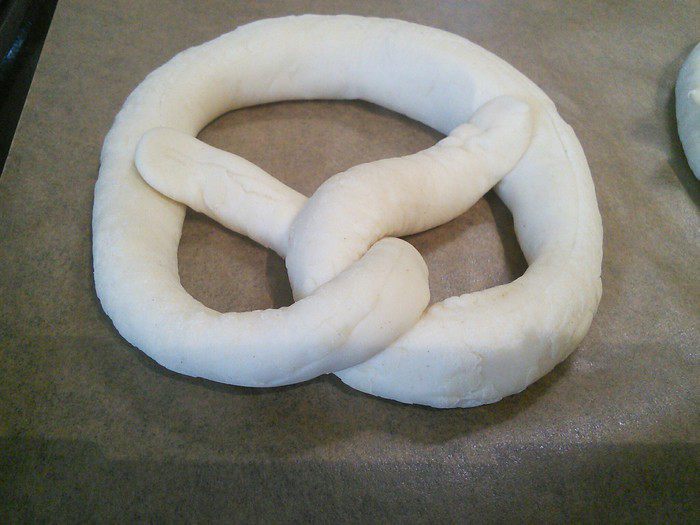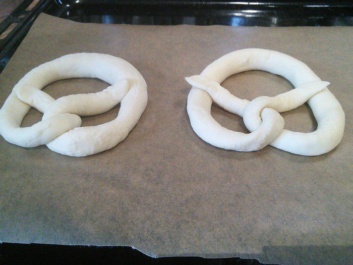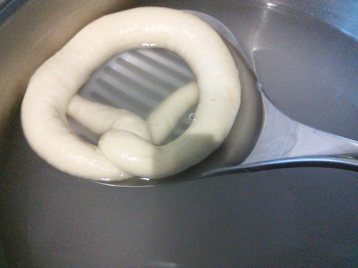 С утра вынуть брецели для аклиматизации на 30 мин., предварительно сняв пленку. За это время сделаем содовый раствор. Нагреть воду в кастрюле до 80°С, уменьшить огонь, добавить соду и тщательно размешать. На 1,5 литра воды необходимо 2 ст. л. пищевой соды. Теперь аккуратно окунуть брецели (по одному с помощью шумовки) в раствор соды на 20 — 25 секунд.