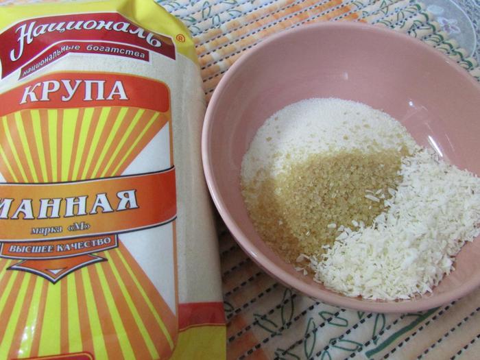 В миске соединить манну крупу ТМ «Националь», сахар и кокосовую стружку. Хорошо все перемешать.