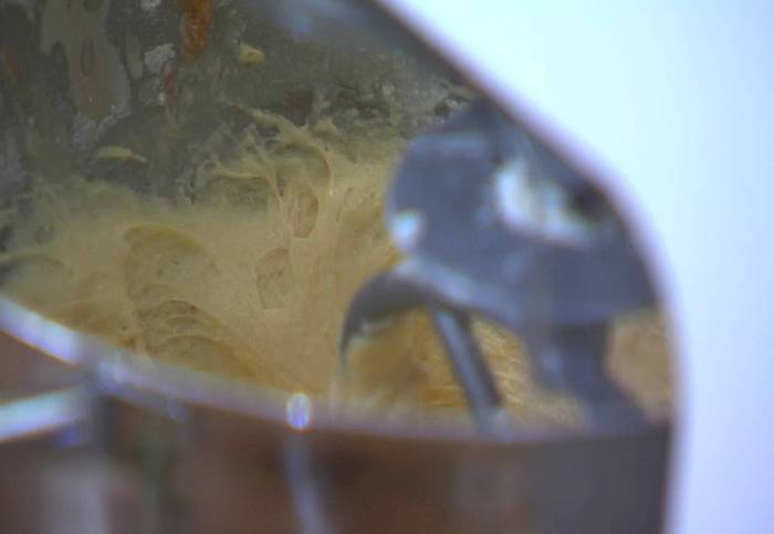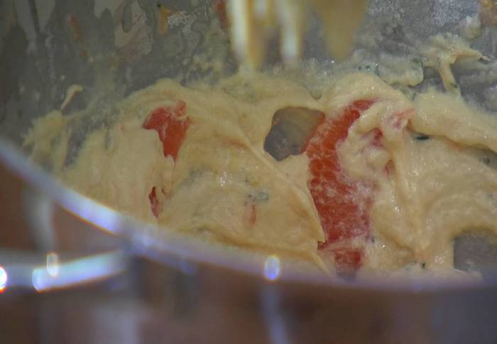 В тесто добавить апельсиновую мякоть, измельченный розмарин, влить 1 ст. ложку кальвадоса и вымешивать все на самой медленной скорости несколько секунд.