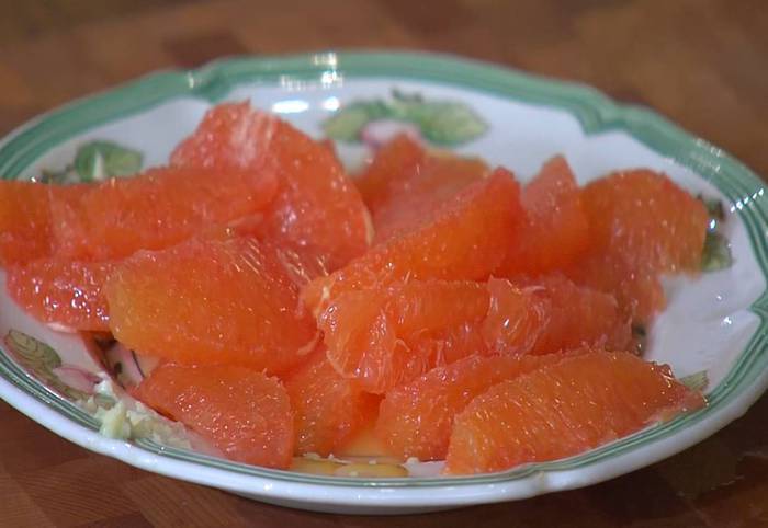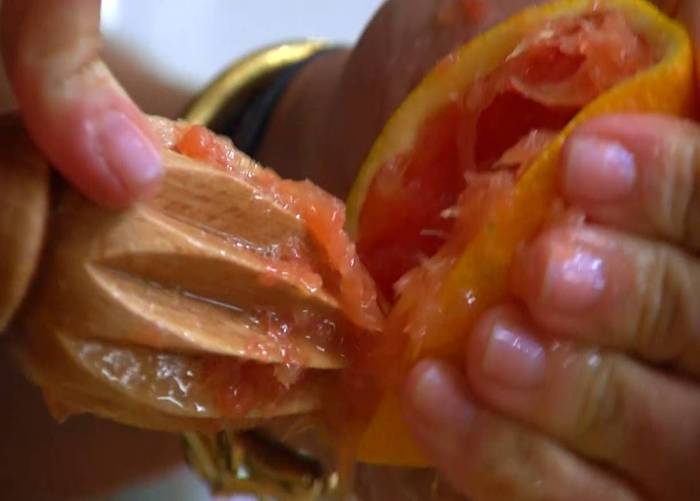 Оставшиеся апельсины очистить от кожуры и вырезать мякоть, сохранив выделившийся при этом сок.