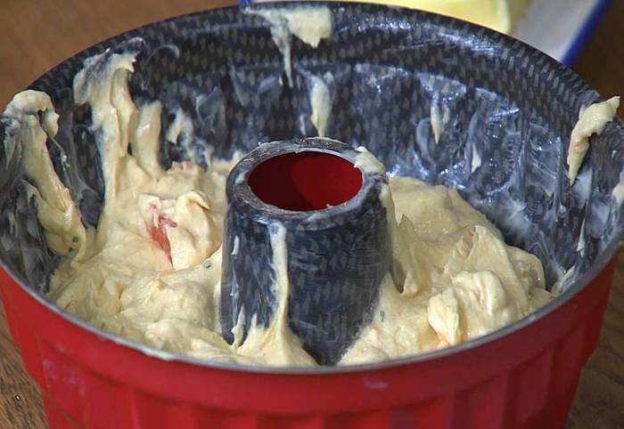 Форму для кекса с выемкой посередине смазать оставшимся сливочным маслом, выложить тесто и разровнять его.