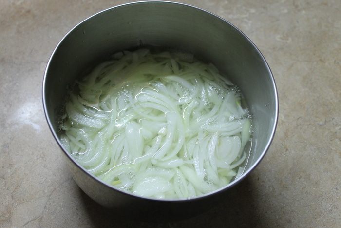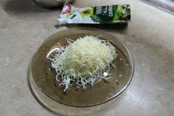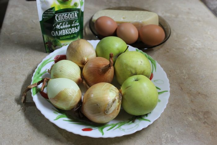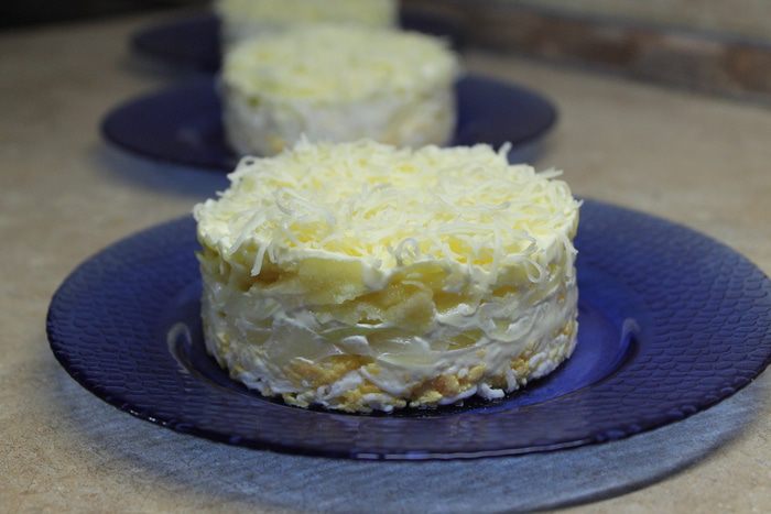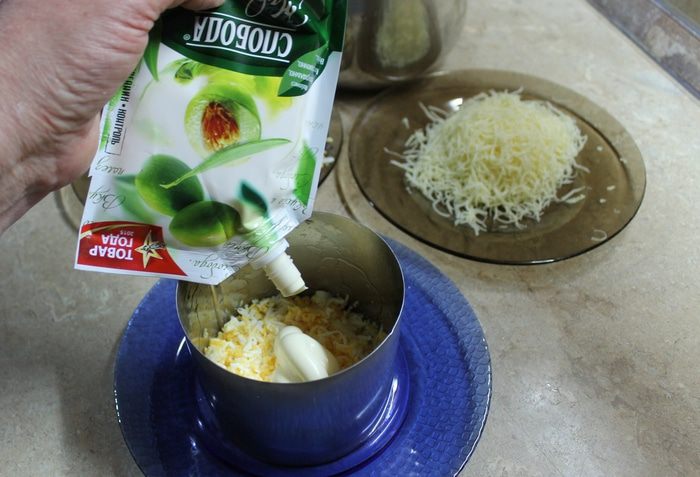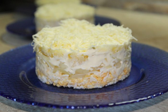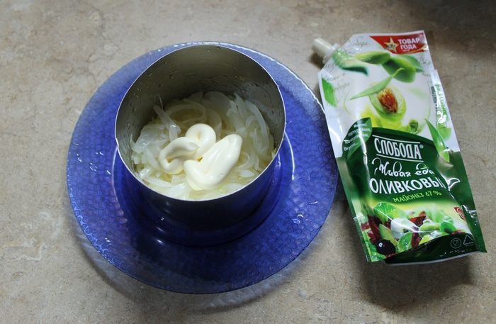 В кулинарное кольцо первым слоем положите яйца, посолив по вкусу, сверху нанесите тонкий слой майонеза. Следующим слоем кладется лук, который нужно отжать от маринада. На каждый последующий слой наносите майонез.