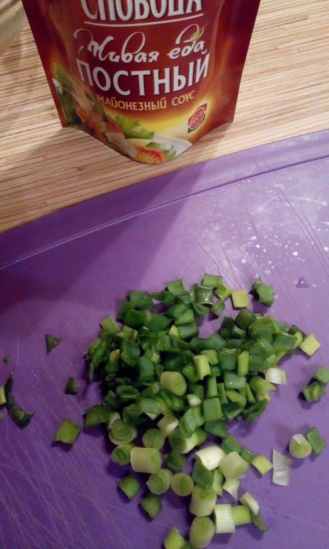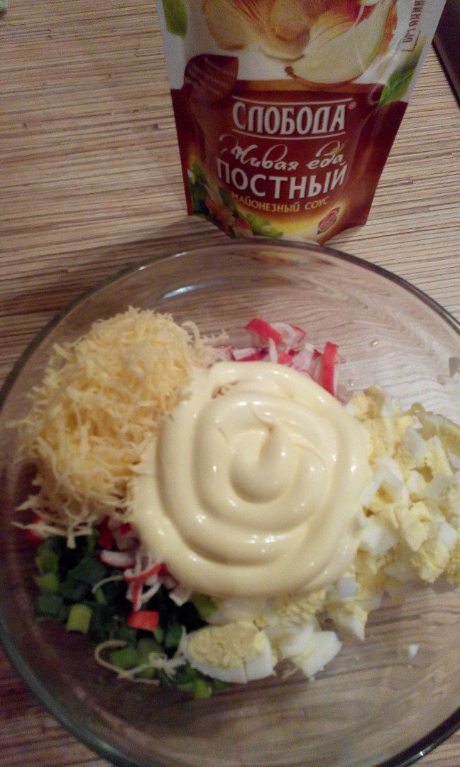 Соединяем компоненты: лук зеленый, крабовые палочки, яйца, сыр и заправляем майонезом. Получается салатная смесь.