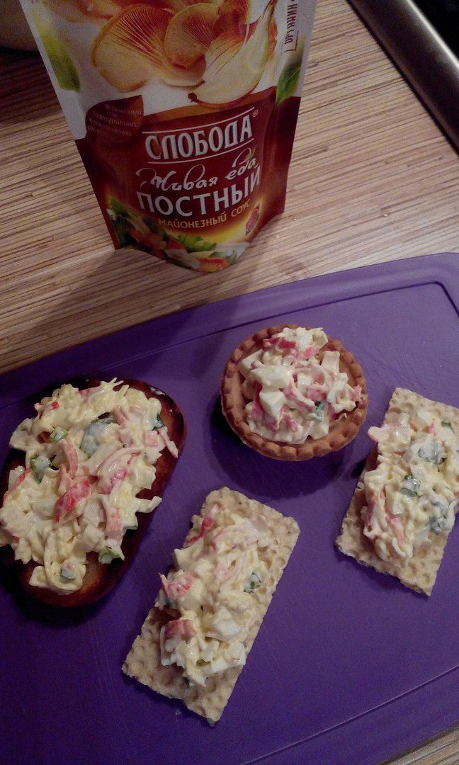 Начинаем формировать наши бутерброды. Наполняем тарталетки, намазываем хлебцы и гренки нашим салатом.